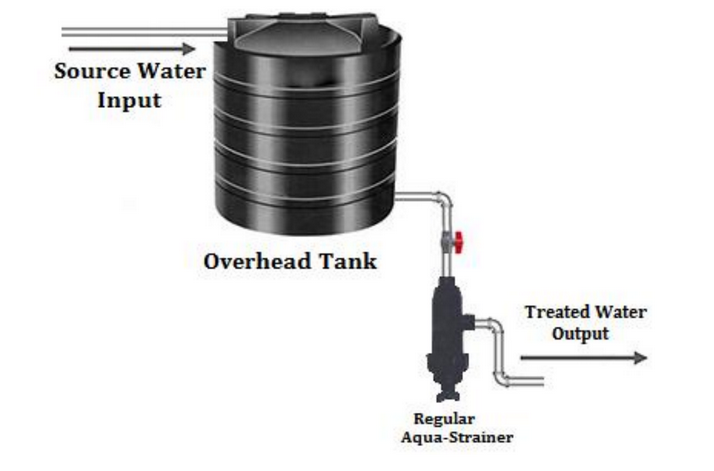 Regular Aqua-Strainer is connected at the outlet of the overhead to the pipeline connection of the house It's connected to 1" outletpipe after the ball valve of water tank with the help of FTA {Female Thread Adaptor}.This system can be installed to the main input pipe connection of the house or can be connected to the input or output of your overhead tank, but we recommend connecting this system to the output of the overhead tank.