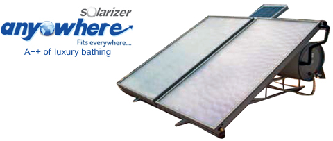 Solarizer Anywhere is a special solar hot water system. The solar system uses a small photovoltaic module to power a pump that circulate the heat exchange medium between the solar collector and storage tank. The tank of this system is mounted below the solar collector and therefore the system is very compact. The floor area occupied by the system is also very small compared to conventional solar system.
